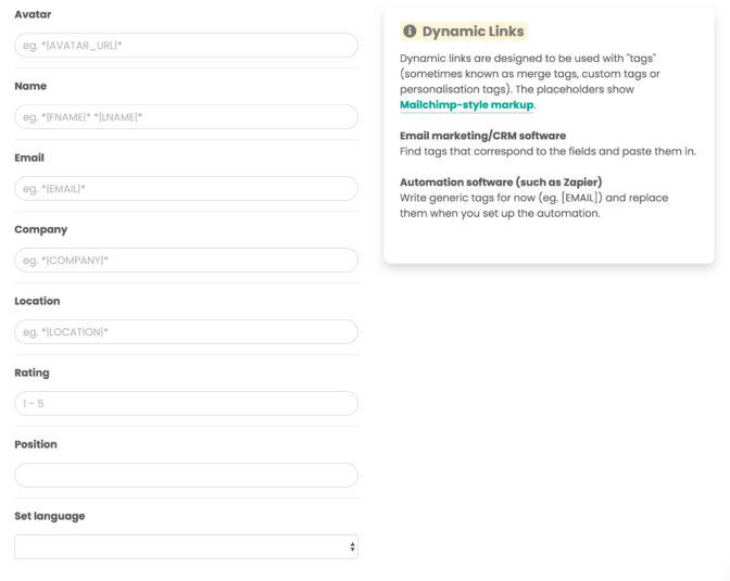 Dynamic links: Enter placeholder tags into the fields you'd like to populate with data available in your CRM, email marketing or automation software.