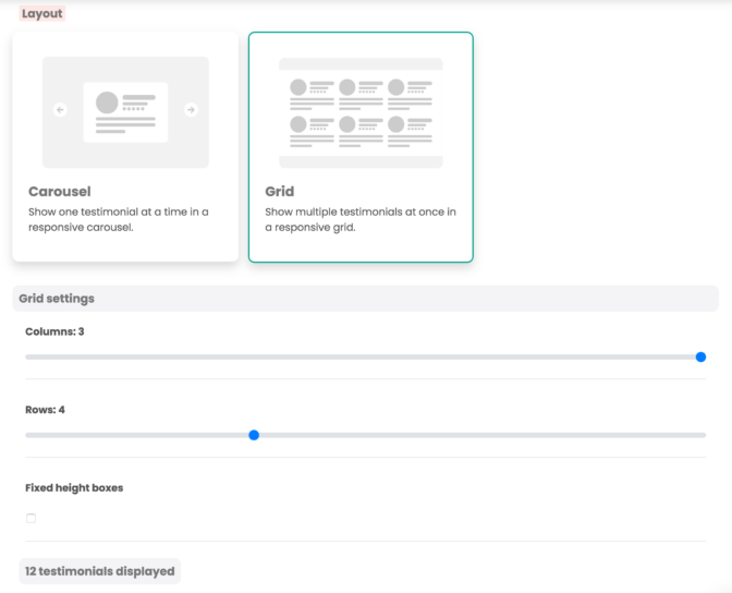 When setting up a multiple testimonials widget, you have a range of settings for the grid layout: